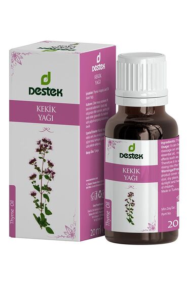 Açıklama: Kekik yağı, kekikten elde edilen bir bitkisel yağdır. Kekik, daha çok ormanlarda, tarlalarda ve çimenlik alanlarda yetişen bir bitki türüdür. Sıcak iklimlerde yetişen bir türdür. Genellikle mutfak uygulamalarında, baharat olarak kullanılmaktadır. Bilimsel adı ile Thymus Vulgaris Leaf Oil, ağız bakımında, aromaterapide ve kozmetik ürünlerde kullanılmaktadır. Kendine özgü kokusunun yanı sıra, zengin içeriği ile en çok tercih edilen bitkisel yağlardan biridir. Destek Kekik Yağı, yerli üretimdir.