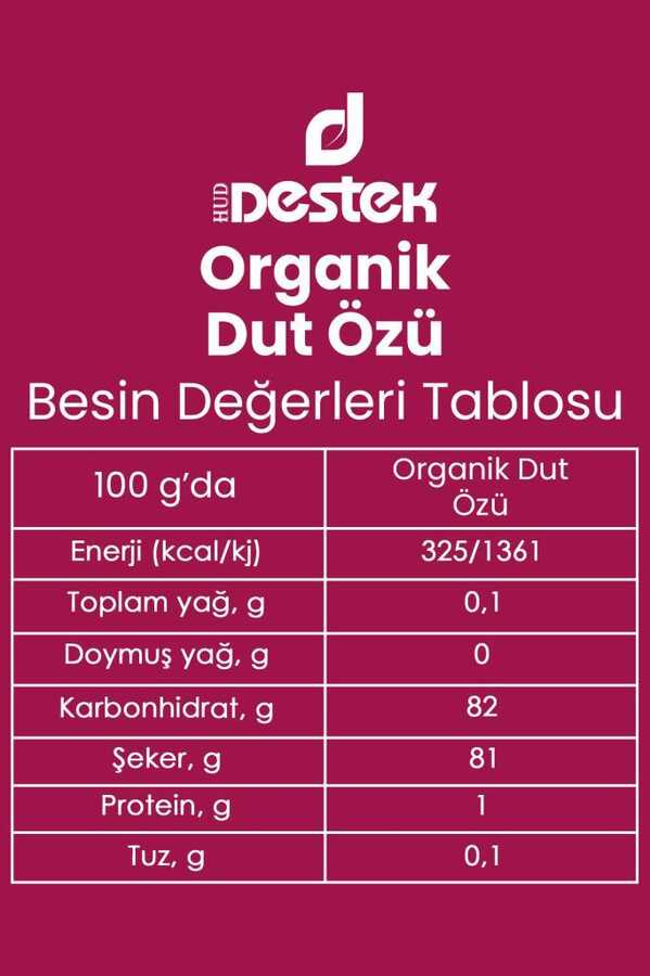 Destek Organik Dut Özü, sadece özenle seçilen yüksek kaliteli meyvelerden elde edilmektedir. İlave şeker içermez. GMP standartlarında üretilmektedir.